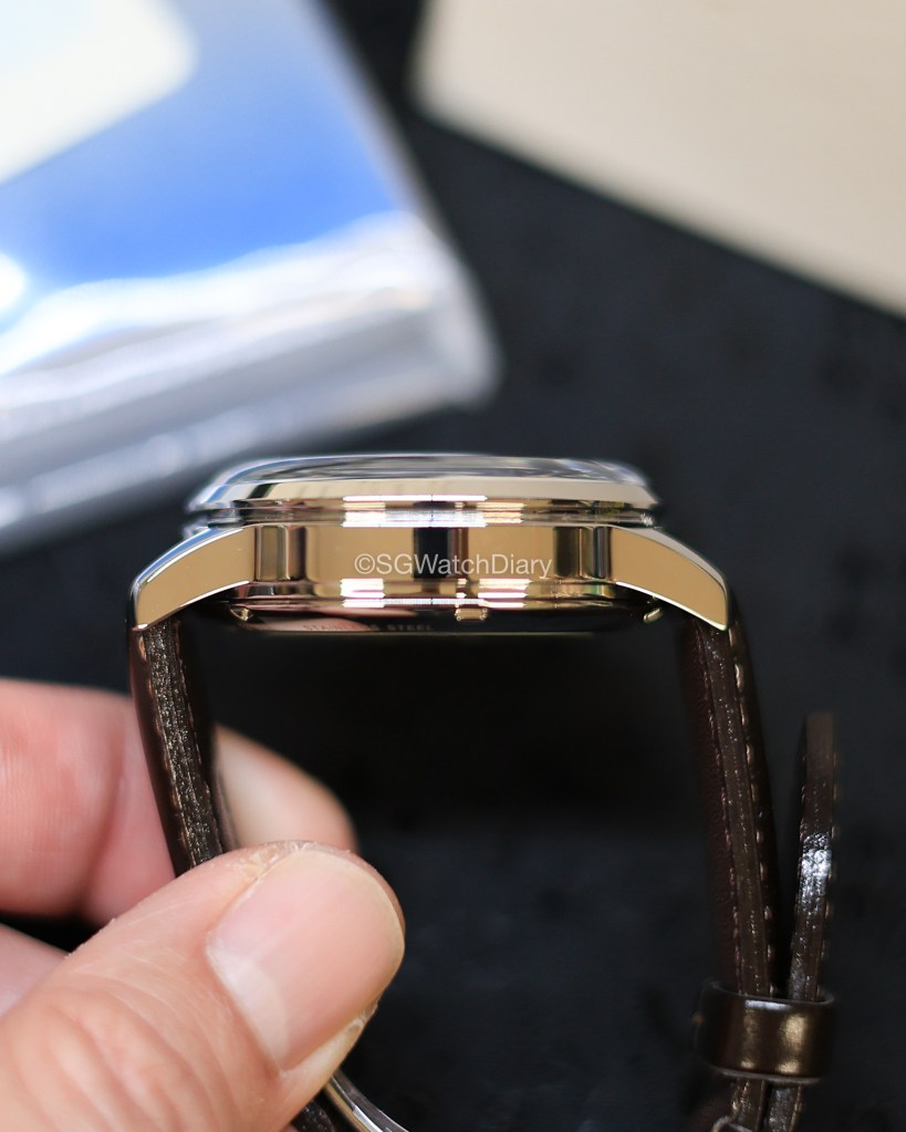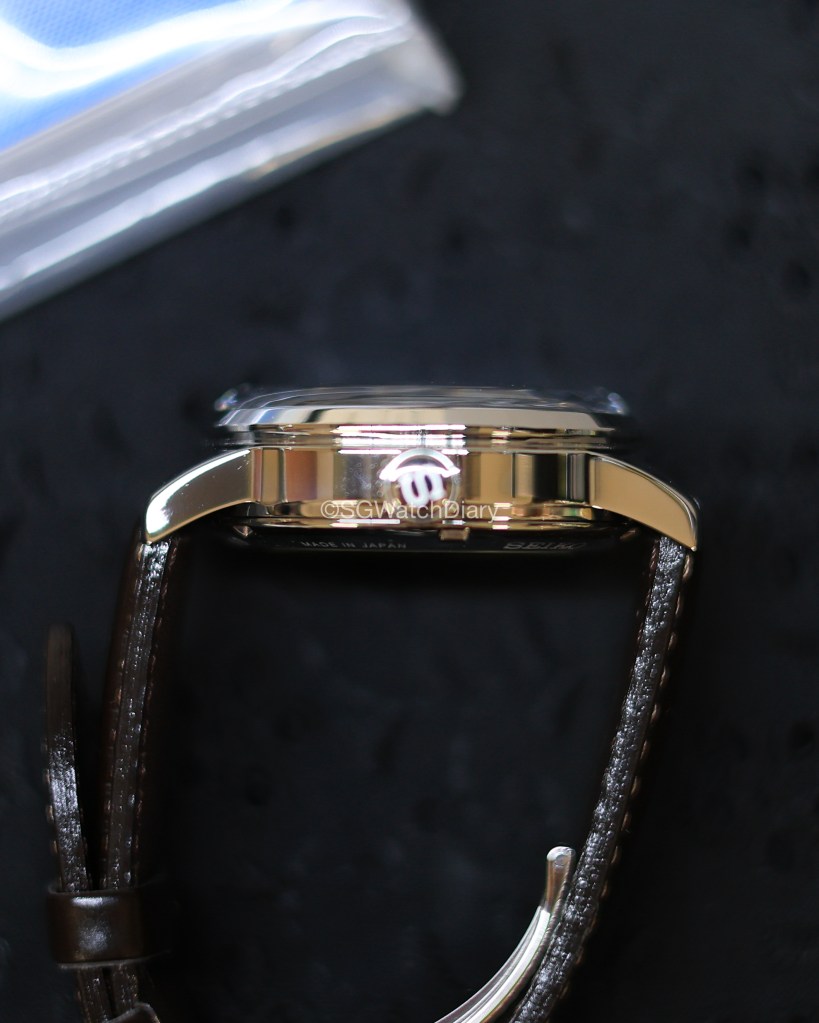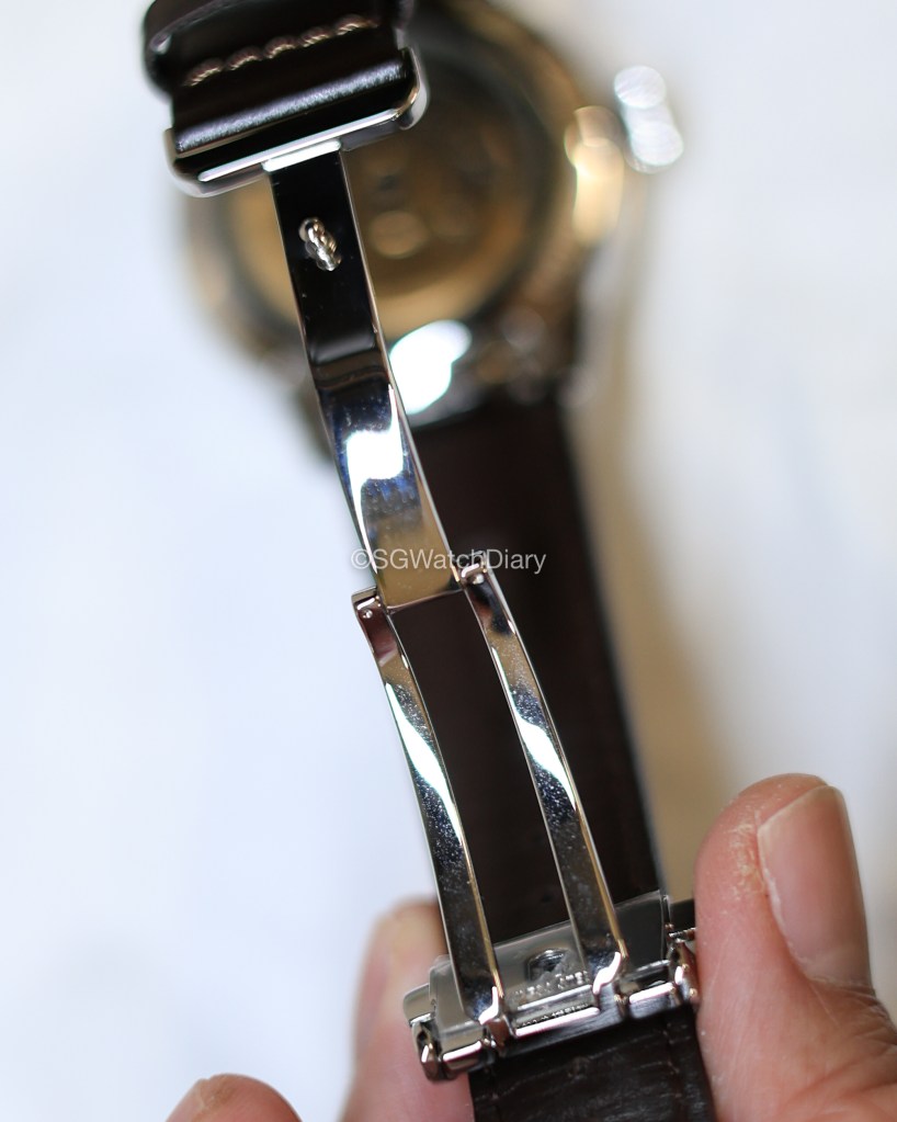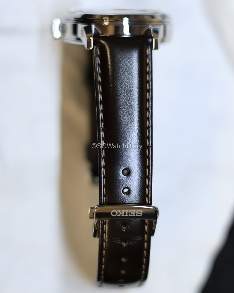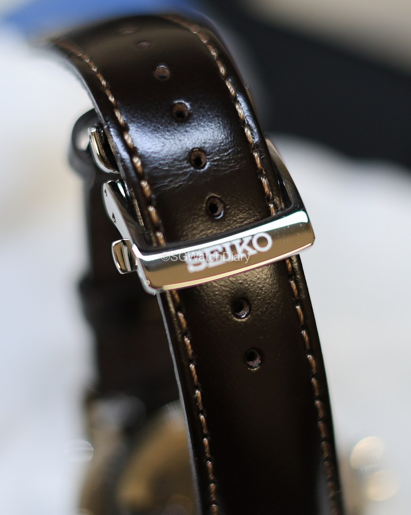 The leather strap is comfortable to wear – as you can see it has not been broken in, still stiff around the lugs there. Strangely despite this, the strap is soft to wear and evidently, it is easy to slot the strap through the strap band keeper (the loops). The clasp and buckle are also made of stainless steel, with the Seiko brand positioned nicely on the buckle with no unnecessary spacings around which can make it look cheap.