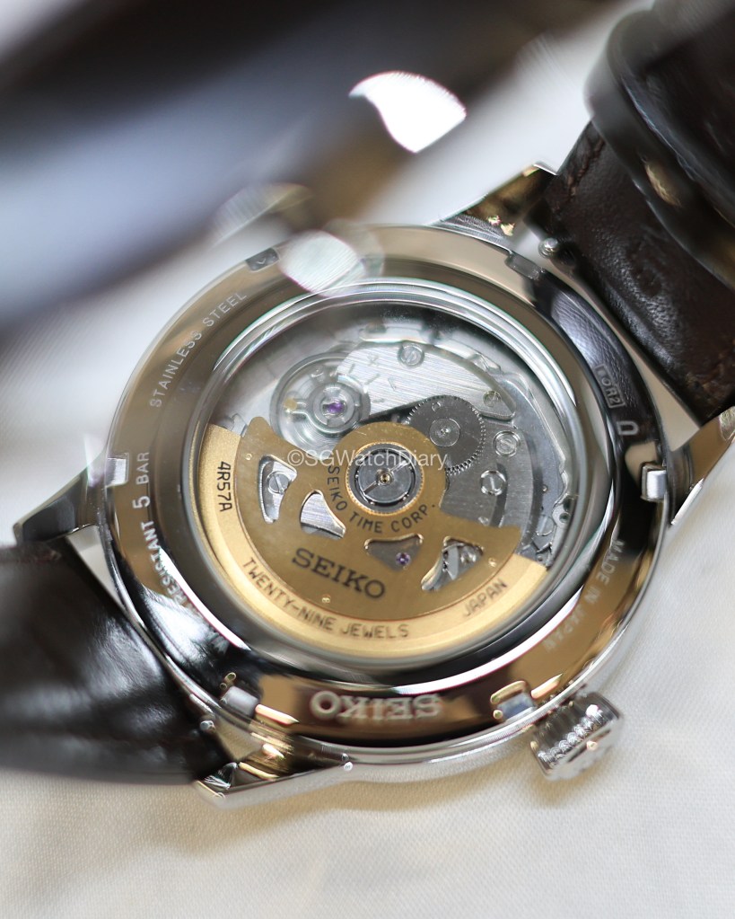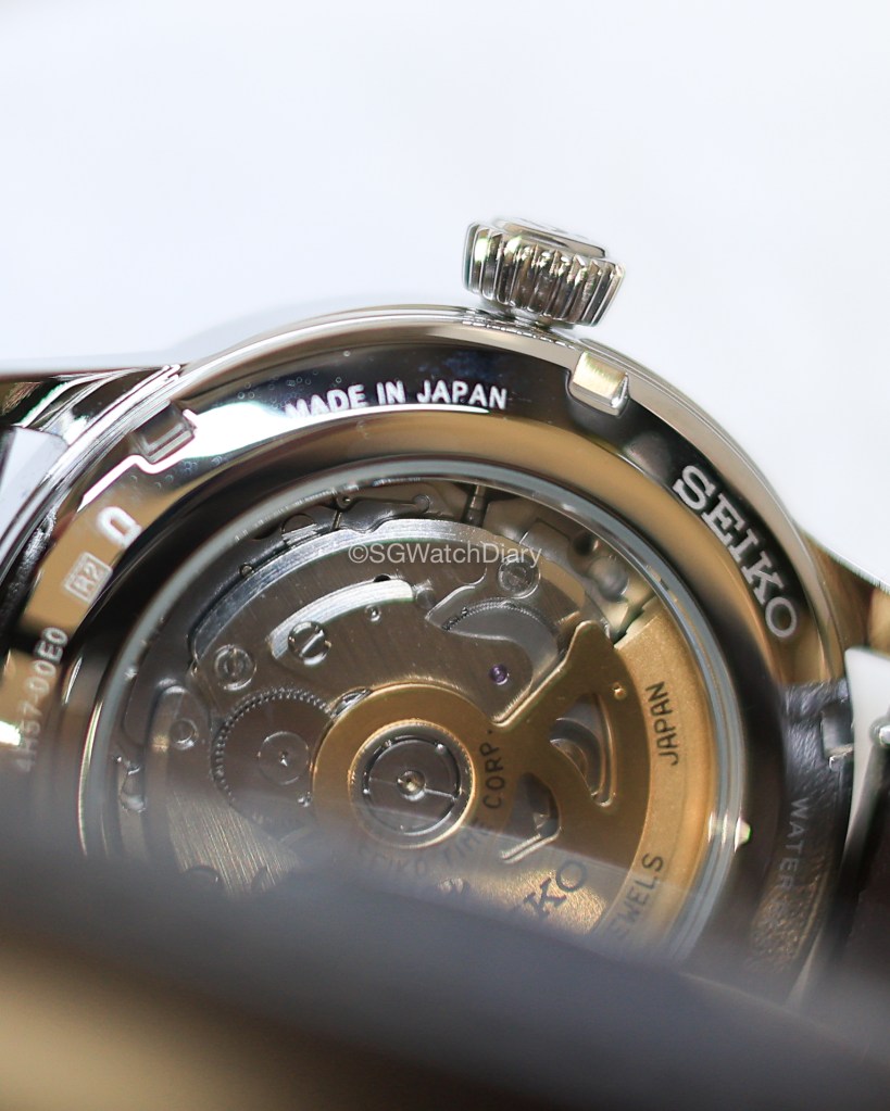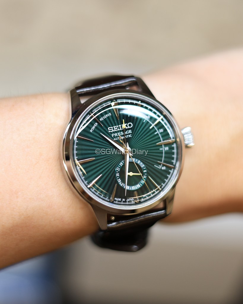 The case is polished stainless steel with a good case diameter of 40.5mm. It isn’t the 38mm everyone in this world at time of writing is after but it can still certainly pull off as a stunning dress watch. Come one, 40.5mm and 38mm from afar who can tell the difference unless he/she is a horologist/watch hobbyist. It wears well on my wrist measuring 16.25 cm in diameter and when you turn your wrist over, the beautiful green dial with the sunburst effect will sure mesmerised you like a charming lady. Smacking close to the 12 o’clock position is the SEIKO brand logo along with the Presage badge with Automatic wording which all the fonts seem to complement so well.