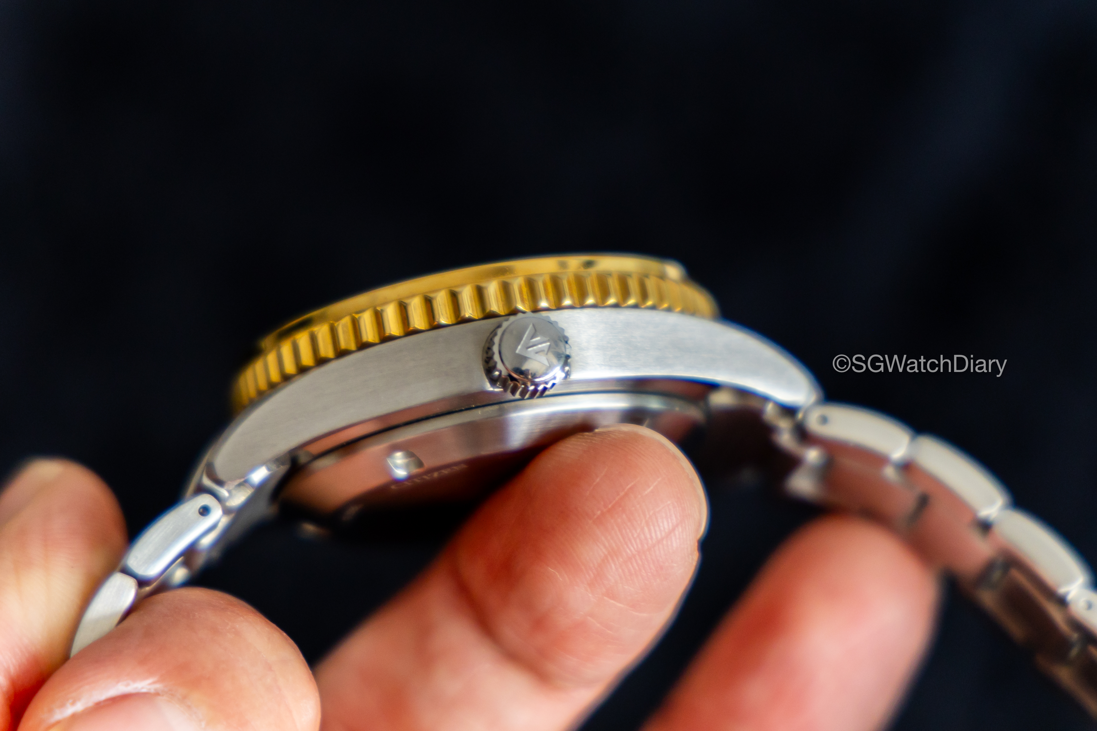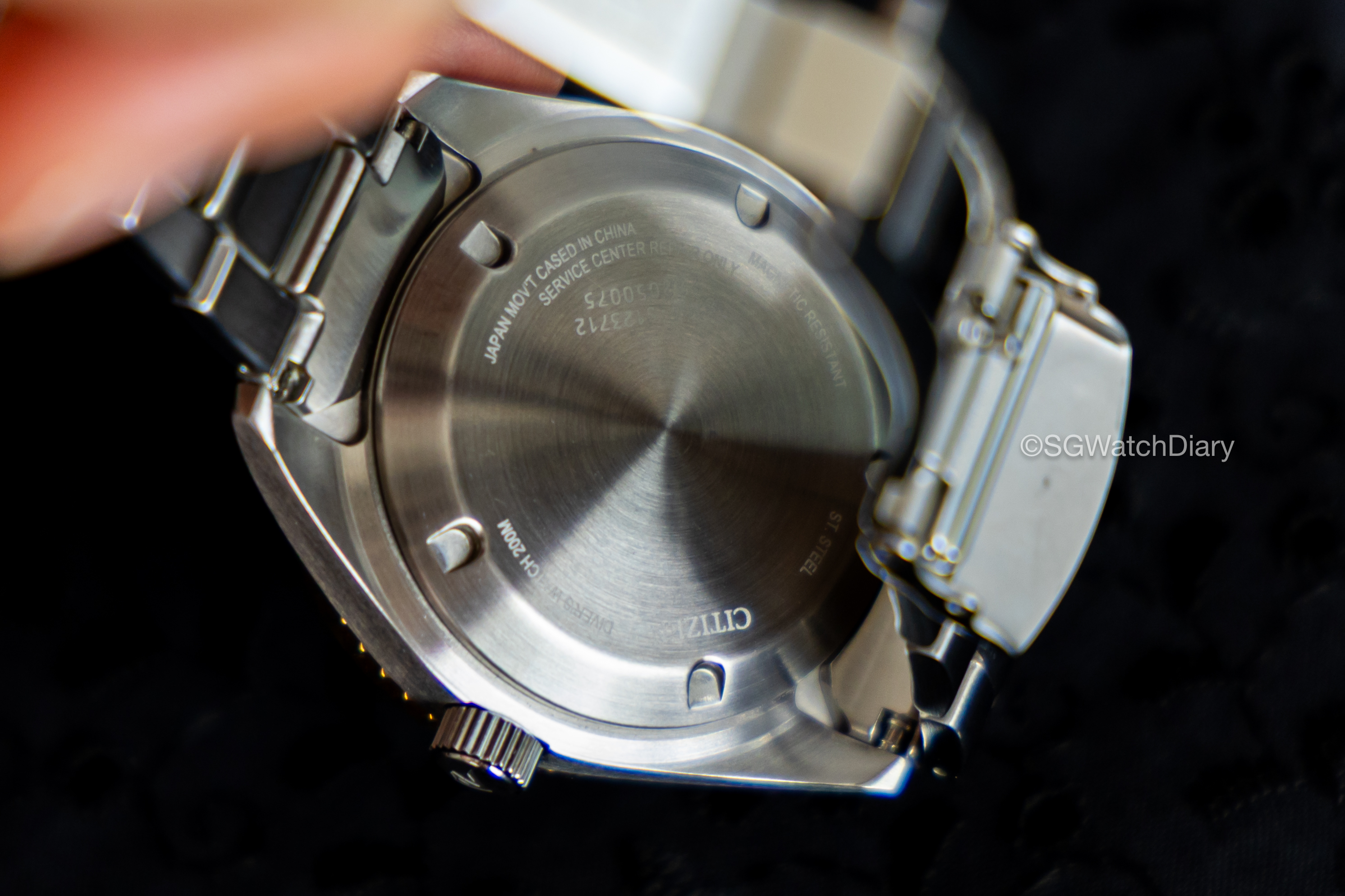 Bezel’s in PVD yellow gold and to my surprise after owning and wearing for a considerably amount of time, it doesn’t fade. It is a unidirectional rotating bezel, and I would like to say, it is well-made, and I mean it doesn’t get rotated easily like in the case of accidental bumps. Looking at the back, it’s a screwed case back full stainless steel and there is no window to see the movement inside. The entire watch is brushed stainless steel, not polished, so you won’t have to worry about getting fingerprints on it.
