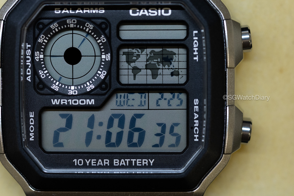 Moving on to the Time “section”, it displays the hour, minute, seconds, month, date and day (and country) that quite large enough to see. I have a little presbyopia (老花眼) so I struggled a bit on the month and date at times. Haiya, last time young no such problem leh…..anyway, it’s still legible lah especially for the ones still having healthy eyes. The World Map near the top right corner, that one is very cool you can see it change as you set the international time, the country you are going to be in or curious what time Tokyo is right now. Although it’s not specific like smartwatch, we must remember this one is really just “seven-segment display” kind of digital tech.