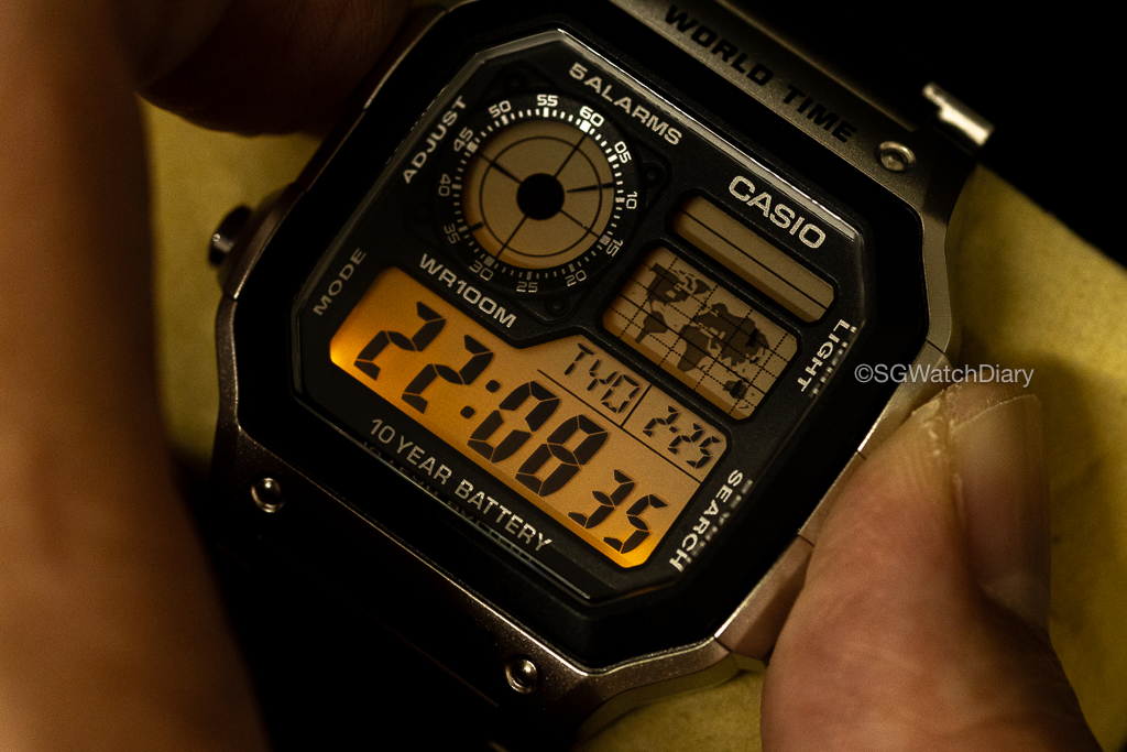 The display looks confusing at first but when taken a closer look, they are actually segregated neatly into “sections” with the time, date and country at the bottom, the analog seconds hand on the top left and the world map towards the top right of the watch. As a Casio Illuminator, there is LED backlight (with selectable illumination duration) bright enough to see the time at the press of the button on the top right corner. That orange, or amber, backlight it was what we used to have back then as a kid and will like try to see if it can shine like a torchlight.